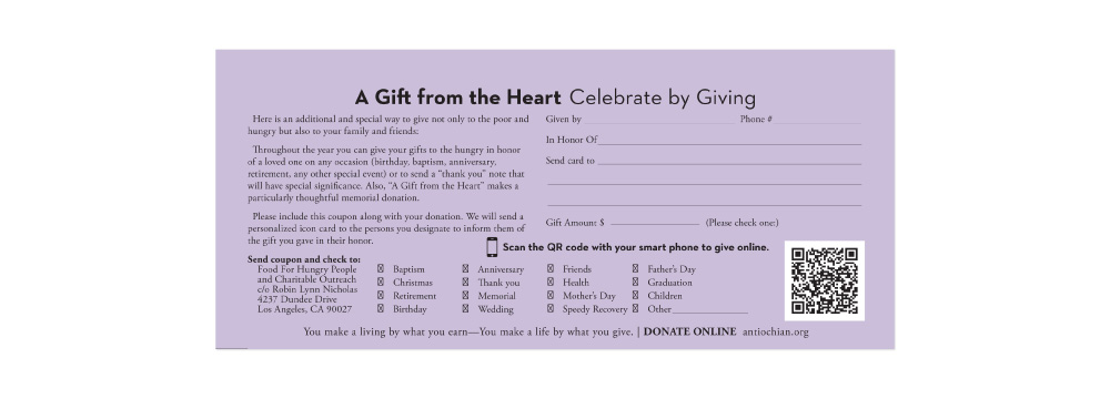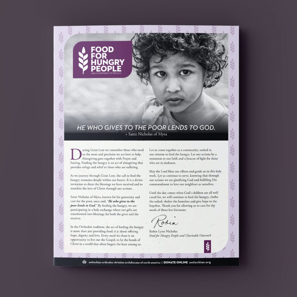 Annual fund-raising direct mail appeal for Food for Hungry People & Charitable Outreach. I created the design and managed print production for this project.